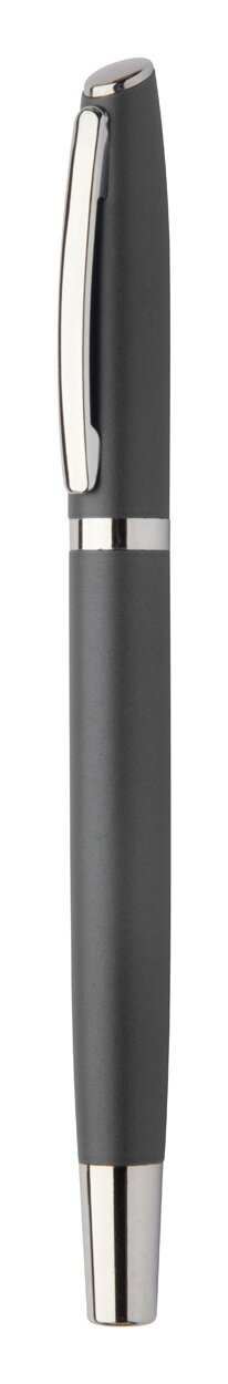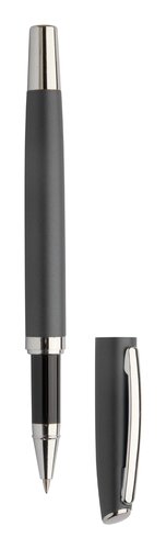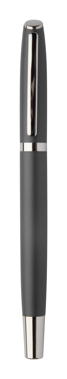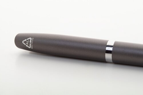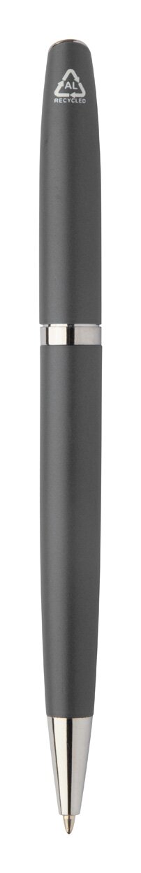 Stiftset aus recyceltem Aluminium mit Rollerball und Kugelschreiber in schwarzer Geschenkbox aus Papier, blauschreibend.