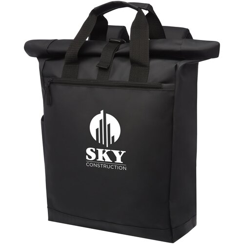 Wasserabweisender Rucksack mit gepolstertem Laptopfach, gepolsterten verstellbaren Schultergurten, Hauptfach mit Reißverschluss und Rollverschluss sowie zwei Tragegriffen.