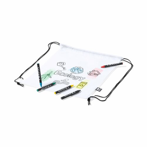 Rucksack mit Kordelzug aus RPET-Vliesstoff in Weiß, speziell zum Ausmalen mit Buntstiften konzipiert. Inklusive 5 Buntstiften in verschiedenen Farben. Mit schwarzen Verschlussbändern und verstärkten Ecken. Außenetikett mit dem RPET-Kennzeichen. RPET-Material wird aus recyceltem Kunststoff hergestellt, um die Wiederverwendung von Kunststoffabfällen zu fördern und zur Nachhaltigkeit des Planeten beizutragen.