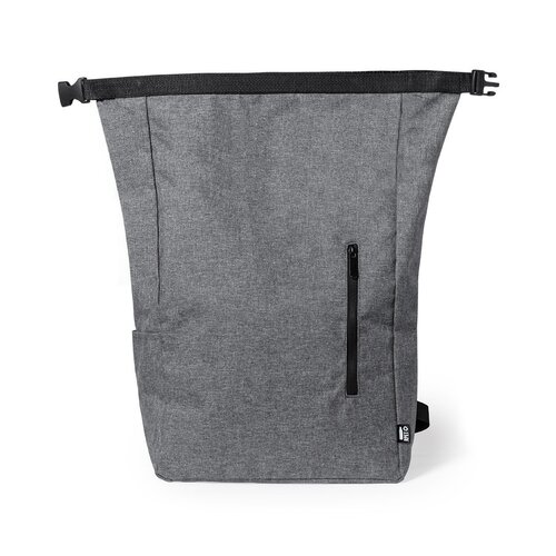 Rucksack der Liene "Natur" aus widerstandsfähigem 300D RPET, hergestellt aus recyceltem Kunststoff, um die Wiederverwendung von Plastikmüll zu fördern und zur Nachhaltigkeit des Planeten beizutragen. Haupttasche mit Schnallenverschluss und Seitentasche. Verstellbare, gepolsterte Schultergurte und RPET-Badge auf dem äußeren Etikett.