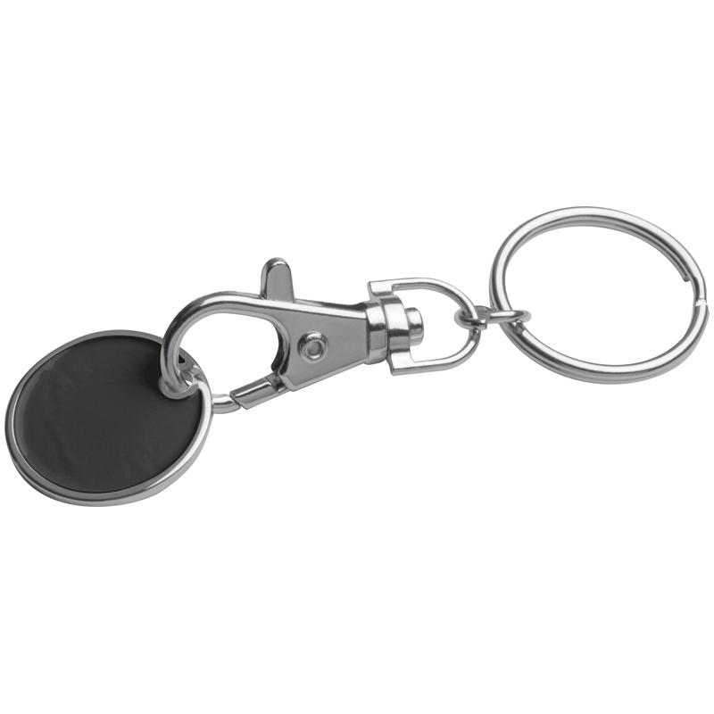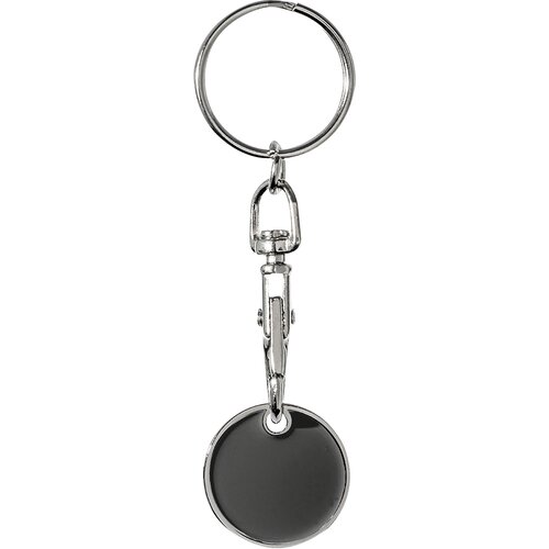 Schlüsselanhänger mit einem durch einen Karabinerhaken abnehmbaren Einkaufswagenchip. Die eine Seite des Chips ist farbig. Ihre Werbung gravieren wir auf die silberne Seite des Chips.