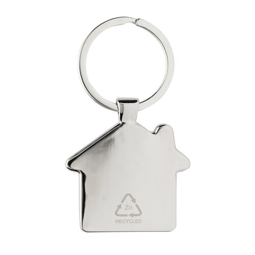 Schlüsselanhänger in Hausform aus RCS recycelter Zinklegierung und Bambus. Gesamter recycelter Inhalt: 76%, bezogen auf das Gesamtgewicht des Artikels. Die RCS-Zertifizierung gewährleistet eine vollständig zertifizierte Lieferkette der recycelten Materialien. Verpackt in Papiertüte.