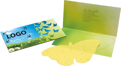 Der Schmetterling enthält bereits Samen für eine Blumenwiese. Einfach auf das Erdreich legen, mit etwas Erde bedecken und gießen. Schon nach wenigen Tagen sprießen die ersten Keimlinge. Das Standardmotiv der Klappkarte bietet viel Platz für den Werbeeindruck ab 250 Stück. Eine eigene Gestaltung der Karte ist bereits ab einer Bestellmenge von 250 Stück möglich. Ein Kuvert ist separat erhältlich, Artikel 6101