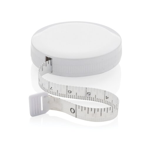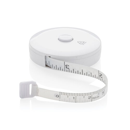 1,5m/60inch Schneidermaßband aus recyceltem Kunststoff mit Rücklaufdruckknopf, für Fitness und Mode. Das Gehäuse ist aus RCS-zertifiziert recyceltem ABS-Kunststoff und Glasfaser hergestellt. Gesamter recycelter Inhalt: 64%, bezogen auf das Gesamtgewicht des Artikels. Die RCS-Zertifizierung gewährleistet eine vollständig zertifizierte Lieferkette für die recycelten Materialien. Das Band ist 8mm breit und per Knopfdruck einziehbar. Verpackt in FSC®-Mix-Verpackung.