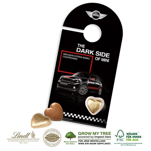 Kreativ, individuell und vielseitig! Ihre individuelle Werbebotschaft, kombiniert mit einem zartschmelzenden Lindt Schokoherz. Eine süßer Gruß mit Genussmoment! Sie wählen die Form: Ob rund, rechteckig, in Herzform oder als Anhänger, damit wird Ihre Werbeaktion zum Volltreffer. Inhalt:
