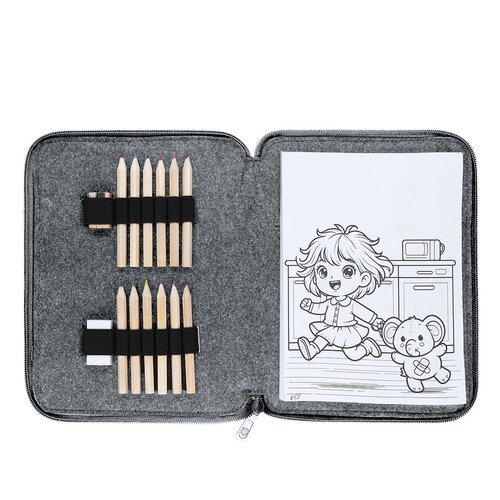 Set aus Buntstiften in einer Hülle aus RPET-Filz. Enthält 11 Buntstifte in verschiedenen Farben in hexagonaler Form, 1 Radiergummi, 1 Holzspitzer und 60 Blätter mit lustigen schwarz-weiß Designs zum Ausmalen. Präsentiert in einer praktischen Hülle mit Reißverschluss in zwei Farben und einem Innenteil mit elastischen Bändern zur Organisation der Zubehörteile. Mit Kennzeichen für RPET.RPET-Filz entsteht durch die Kombination des Recyclingprozesses von Kunststoffmaterialien mit der jahrhundertealten Technik der Filzherstellung und ergibt ein eco-trend Material, das nicht nur recycelten Ursprungs ist, sondern auch recycelbar wird.