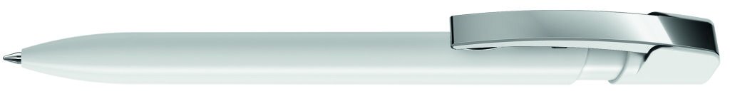 Druckkugelschreiber mit gedeckt glänzendem Gehäuse in uni weiß oder schwarz und farbig transparent glänzendem Cliphals, flexiblem Metallclip glanzverchromt.