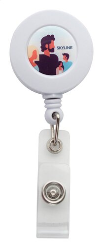 Ausweishalter mit Zugschnur und Druckknopf, aus transparentem Kunststoff.