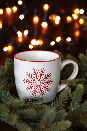 Keramiktasse im Weihnachtsdesign mit gesprenkelter Oberfläche. Füllmenge: 320 ml. Einzeln in Kraftpapierbox.