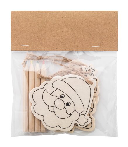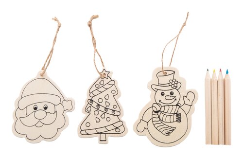 Weihnachtsbaumschmuck-Set zum Ausmalen mit Karte aus Kraftpapier. Inklusive 3 Motive (Weihnachtsmann, Weihnachtsbaum und Schneemann) aus Holz mit Hanfschnur und 4 Farbstiften.