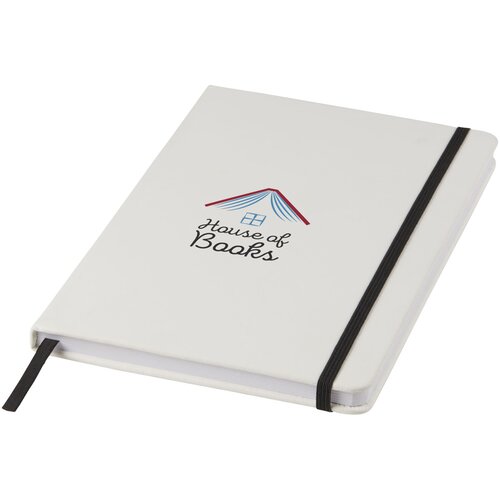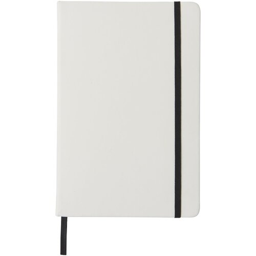 Weißes A5 Notizbuch mit farbigem Gummizug und Lesebändchen. Enthält 80 Blatt (60 g/m²) liniertes Papier.