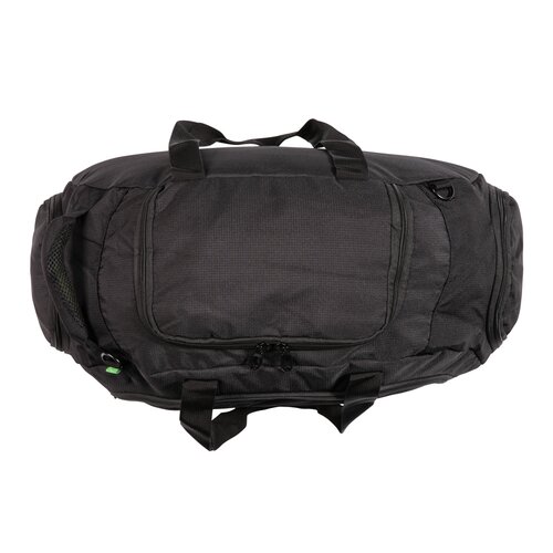 600D Ripstop, Fronttasche mit Organizer und Reißverschluss, Seiten- und Schuhfach, gummierte Tragegriffe sowie ein Schultergurt, und mit 4 Füßen an der Bodenseite. PVC-frei.