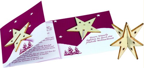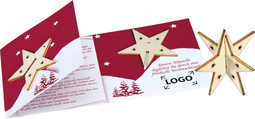 Diese ansprechende Weihnachtskarte enthält 2 Holzteile, die zu einem Holzstern zusammengesteckt werden können. Platz für den Werbedruck ist auf dem Standardmotiv der Karte oder eine eigene Gestaltung, jeweils ab 100 Stück. Ein Kuvert ist separat erhältlich Art. 6101.
