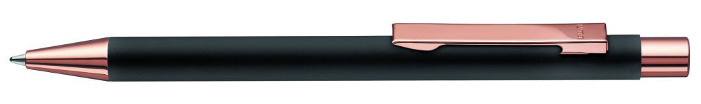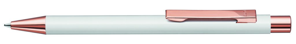 Metall-Druckkugelschreiber mit glänzendem Gehäuse in weiß oder mattem Gehäuse in schwarz. Metallclip, Metallspitze und Drücker roségold glänzend.