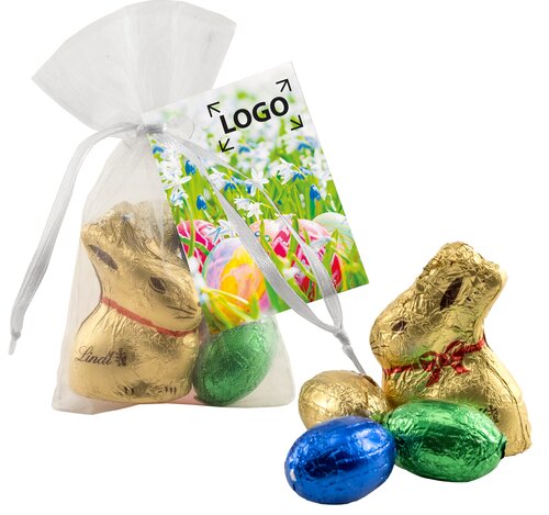 Der Lindt Goldhase wird von vier Schokoeiern begleitet und ist eine willkommene feine Osterfreude. Das Anhängekärtchen bietet genug Platz für Ihre Werbeanbringung. Eine individuelle Gestaltung ist ebenso ab 250 Stück möglich.