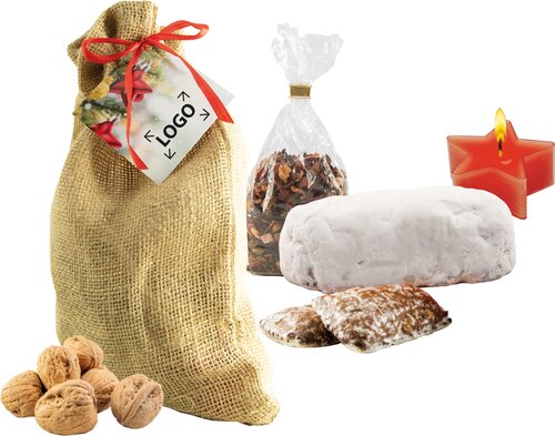 Unser nachhaltiges Jutesäckchen ist gefüllt mit Tee, leckeren Süßigkeiten und einer dekorativen Kerze. Ihre Kunden werden dankbar sein für diese weihnachtliche Aufmerksamkeit. Ihre Werbebotschaft ist als Eindruck in unser Standardmotiv oder als individuelle Gestaltung bereits ab 100 Stück möglich.