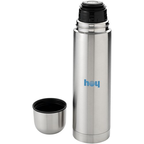Doppelwandige Isolierflasche mit Becher im Deckel. Ausgießer mit Einhand-Druckknopf, der sich automatisch schließt, wenn der Deckel auf die Flasche geschraubt wird. Volumen 750 ml.