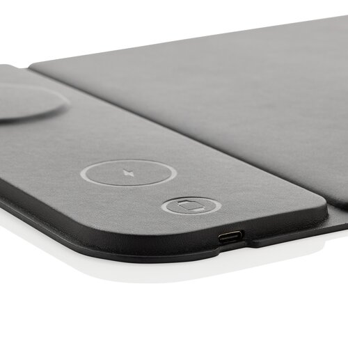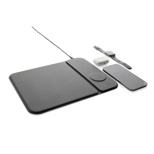 Luxuriöses 3-in-1-Mauspad mit kabellosem Ladegerät, hergestellt RCS aus recyceltem PU. Gesamter recycelter Inhalt: 5%, bezogen auf das Gesamtgewicht des Artikels. Die RCS-Zertifizierung gewährleistet eine vollständig zertifizierte Lieferkette der recycelten Materialien. Das kabellose Ladegerät ist mit einem magnetischen kabellosen 15W-Ladegerät und einem zusätzlichen kabellosen 5W-Ladegerät ausgestattet, das für Ohrhörer oder andere kleine kabellos aufladbare Geräte geeignet ist, sowie einem kabellosen 2,5W-Ladegerät für Smartwatches (nur Apple-Uhren). Inklusive RCS-zertifiziertem 120cm langem Kabel aus recyceltem TPE. Verpackt in FSC®-Mix-Verpackung. Artikel und Zubehör 100% PVC-frei. Input: 9V/3A für optimale Nutzung. Output: Telefon: 9V/1.1A; 9V/1.67 A/(15W), Kopfhörer: 5V/1A (5W), Uhr: 5V/0,5A.
