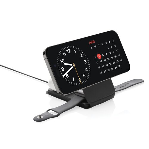 Luxuriöses und faltbares kabelloses 3-in-1-Ladegerät aus RCS-zertifiziert recyceltem PU. Gesamter recycelter Inhalt: 5%, bezogen auf das Gesamtgewicht des Artikels. Die RCS-Zertifizierung gewährleistet eine vollständig zertifizierte Lieferkette für die recycelten Materialien. Das kabellose Ladegerät ist auf der Vorderseite mit einem magnetischen kabellosen 15W-Ladegerät ausgestattet. Auf der Rückseite befindet sich ein zusätzliches kabelloses 5W-Ladegerät, das für Ohrhörer oder andere kleine kabellos aufladbare Geräte geeignet ist, sowie ein kabelloses 2,5-W-Ladegerät für Ihre Apple Watch. Inklusive 120cm langem, RCS-zertifiziert recyceltem TPE-Kabel. Verpackt in FSC®-Mix-Kraftverpackung. Artikel und Zubehör 100% PVC-frei. Input: 9V/3A für optimale Nutzung. Output: Vorderseite: 9V/1.1A; 9V/1.67 A/(15W), Kopfhörer: 5V/1A (5W), Uhr: 5V/0,5A.