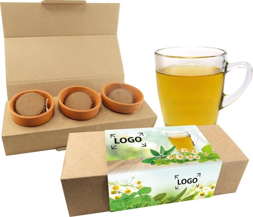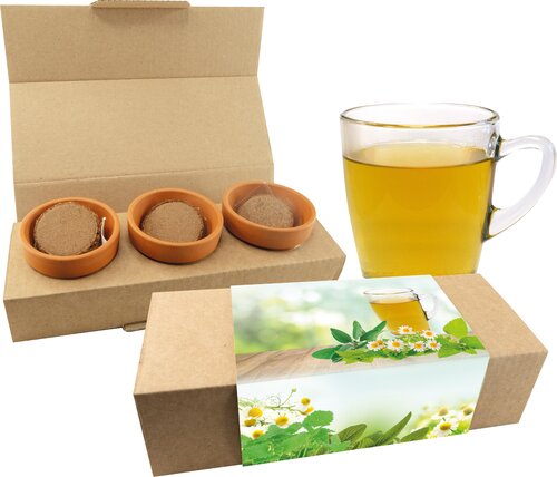 Ein Tee-Garten der wächst. Kamille, Melisse und Salbei gehören zu den Klassikern unter den Kräutertees und sind hier als Samen vertreten. Die Banderole bietet viel Platz für Ihre Werbebotschaft oder, ebenfalls ab 250 Stück für Ihre individuelle Gestaltung.