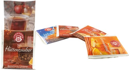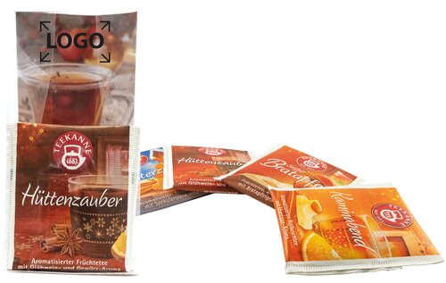 Vier verschiedene Winterteesorten zum Ausprobieren. Das ist ein Giveaway, das gerne in der kalten Zeit angenommen wird und ihre Werbebotschaft bleibt in Erinnerung. Das Kärtchen kann mit Ihrem Eindruck versehen werden oder ebenfalls ab 250 Stück individuell gestaltet werden.