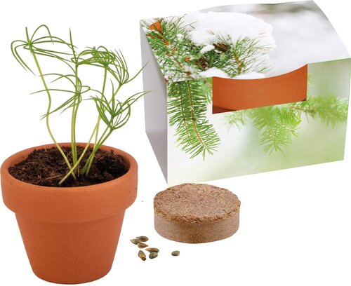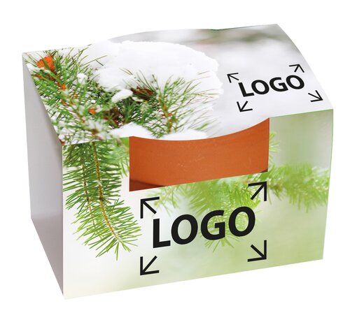 Blumig, sonnig, frisch. Das kleine Tontöpfchen mit Erdtablette und Fichte-Samen. Die Banderole bietet auf der Vorderseite einen sichtbaren Platz für Ihre Werbebotschaft. Direkt auf dem Tontöpfchen ist ein Aufdruck im Tampondruck möglich. Eine Gestaltung der Banderole ab 250 Stück.