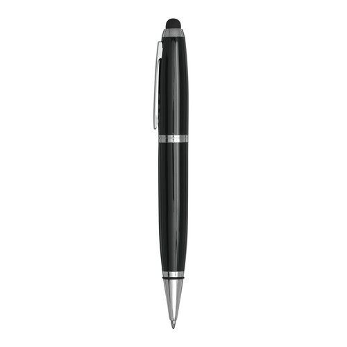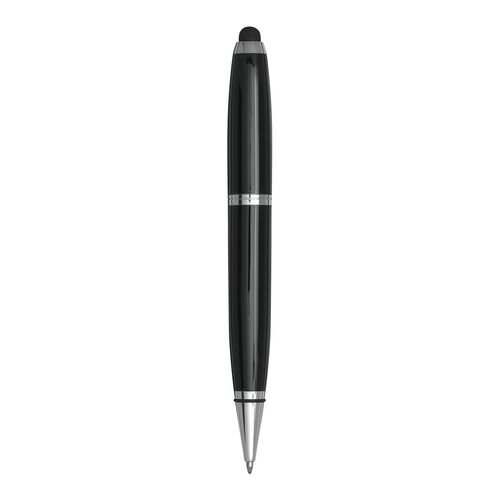 Edelstahl-Kugelschreiber TOUCH DOWN: mit Großraummine und Drehmechanismus, Touchscreen-Spitze am Schaftende, in Klavierlack-Optik und mit silbernen Dekorelementen, Clip im PiCOWORLD-Design, schwarzschreibend, Lieferung in Geschenkbox