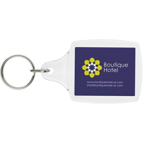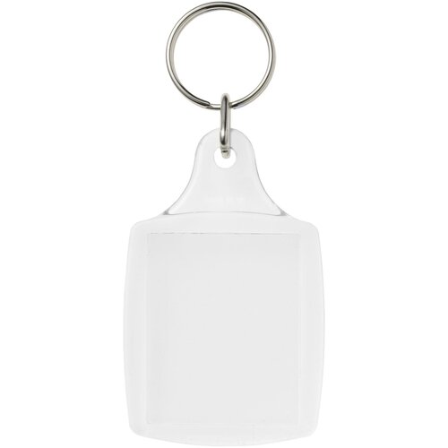 Transparenter A5-Schlüsselanhänger mit metallenem Schlüsselring. Zur Aufnahme eines Papiereinsatzes oder eines Passfotos geeignet. Abmessungen der Druckeinlage: 4,5 cm x 3,5 cm.