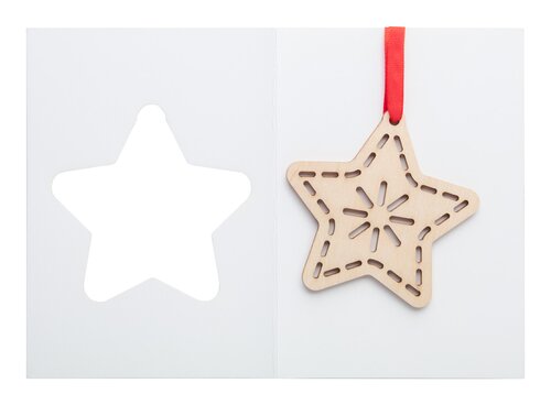 Individuelle Weihnachtskarte mit Weihnachtsbaumschmuck aus Sperrholz mit roter Schleife. Der Preis ist inklusive Vollfarbdruck auf beiden Seiten der Karte. Inkl. C6 Briefumschlag. Mindestmenge: 100 Stk.