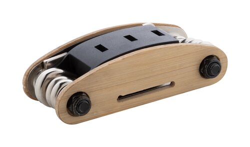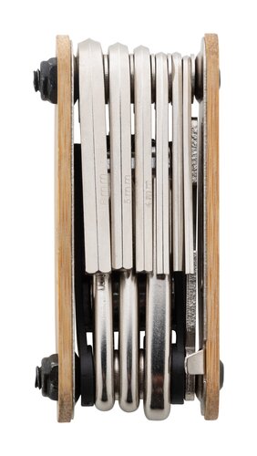 Multitool aus Edelstahl mit Bambusgriff und 14 Funktionen. Enthält Schlitz- und Kreuzschlitzschraubendreher, 5 Inbusschlüssel, 3 Inbuseinsätze mit Verlängerungsstange und 4 Gabelschlüssel.