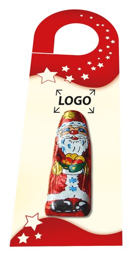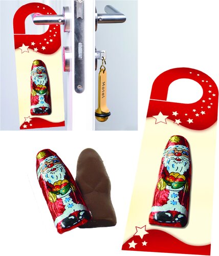 Eine kleine süße weihnachtliche Überraschung für Ihre Gäste. Mit diesem Schokoladen-Weihnachtsmann zaubern Sie mit Sicherheit ein Lächeln auf das Gesicht Ihrer Gäste, wenn diese die süße Überraschung an ihrer Tür vorfinden. Platz für den Werbedruck ist auf dem Standardmotiv oder eine eigene Gestaltung des Türanhängers, jeweils bereits ab 250 Stück.