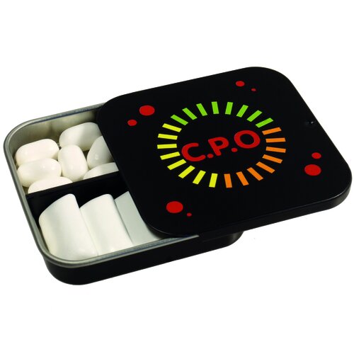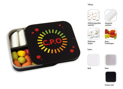 Diese besondere Dose offenbart unter ihrem Schiebedeckel gleich zwei Füllungen, getrennt durch einen Steg. Die Füllungen können flexibel miteinander kombiniert werden und die drei Farbvarianten der Metalldose machen die Individualisierung perfekt.