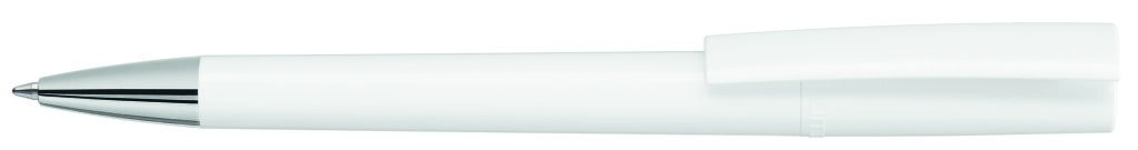 Drehkugelschreiber mit gedeckt glänzendem Gehäuse in weiß oder schwarz und silbernem Stopfen im Oberteil. Schwere Metallspitze glanzverchromt.