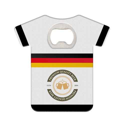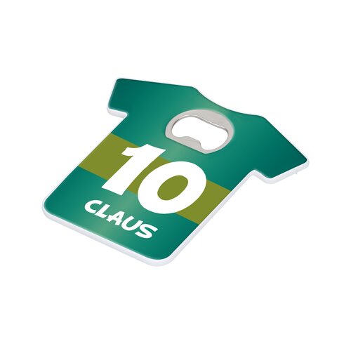Ein Artikel – zwei Funktionen. Untersetzer in Trikot-Form aus ABS mit integriertem Flaschenöffner. Die Bodenfläche ist mit einem EVA-Badge versehen, das einen Anti-Rutsch-Effekt garantiert.