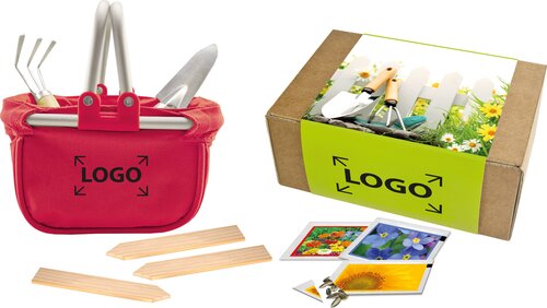 Der Utensilo „Garten“ ist perfekt ausgestattet für die erste Aussaat, mit einer handlichen Harke, Schaufel, Samentütchen (Zwergsonnenblume, Vergissmeinnicht, bunte Blumenmischung) und Holzstecketiketten. Der Werbedruck erfolgt auf dem Standardmotiv, ab 250 Stück