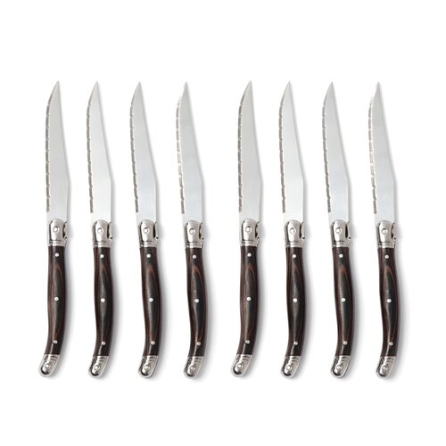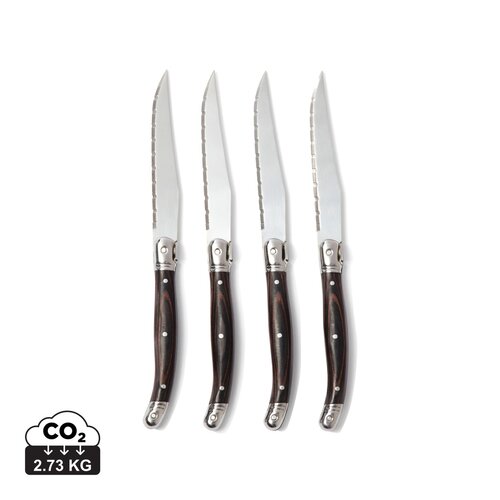 Fleischmesser im typisch französisch inspirierten Bistrostil von hoher Qualität. Schwarzer Holzgriff und Klinge aus hochqualitativem Edelstahl. Die Klinge hat einen feinen Schliff, sodass Sie mit so wenig Widerstand wie nur möglich durch das Fleisch schneiden. Ein Set mit vier Messern, die Sie einfach mit den Gabeln kombinieren können, die Sie selbst zu Hause haben. Verpackt in einer exklusiven Geschenkbox.