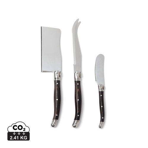 Ein exklusives Käse-Set, das aus zwei Käsemessern und einem Buttermesser mit schwarzem Holzgriff und Edelstahl, besteht. Verpackt in einer exklusiven Geschenkbox.