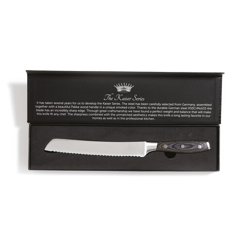 Exklusives Brotmesser aus der Kaiser Serie. Die Entwicklung dieser Messerserie hat mehrere Jahre gedauert. Der X50CrMoV15 Stahl ist sorgfältig aus Deutschland ausgewählt, der Griff ist aus Pakkaholz. Der Griff ist leicht zu greifen, was zusammen mit seinem ausgewogenen Körper das Arbeiten komfortabler und einfacher macht. Die guten Eigenschaften des deutschen Stahls führen dazu, dass die Klingen schmutzabweisend sind und keinen höheren Wartungsaufwand als Schleifen erfordern. Seine Schärfe hält lange an und wenn Sie es schleifen müssen, ist es eine einfache Aufgabe.
