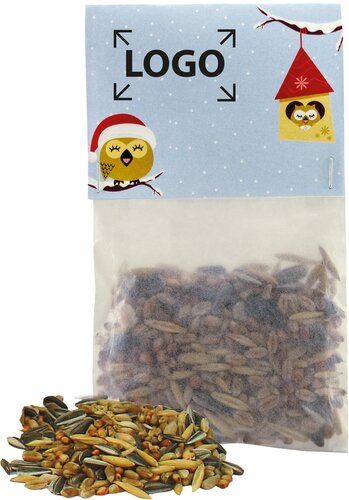 Ein sympathisches Giveaway nicht nur für Vogelliebhaber. 20 g Wildvogelfutter sind in der Pergamintüte enthalten. Ihr Werbeeindruck oder eine individuelle Gestaltung des Headers ist ab 250 Stück möglich.