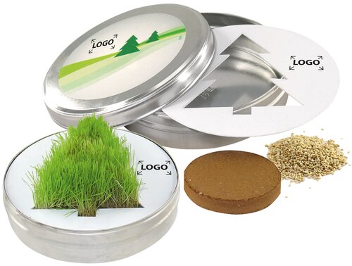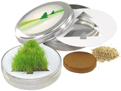 Der etwas andere Tannenbaum zu Weihnachten. Dieser wächst mit Hilfe einer Tannenbaum-Schablone aus Gras-Samen. Einfach den Samen in die gestanzten Aussparungen der Schablone einsäen, vorsichtig wässern und bald entsteht der Tannenbaum. Den Rasenschnitt der Gras-Pflanzen bald vornehmen, damit die Konturen gut sichtbar bleiben. Alles ist für die Anzucht praktisch in einer Metalldose verpackt. Ein eigenes Logo der Wachstumsschablone ist ab 1.000 Stück möglich. Der Deckelaufkleber bietet Platz für Ihren Werbeeindruck oder eine eigene Gestaltung, jeweils ab 250 Stück. Ein Tampondruck direkt auf der Wachstumsschablone ist möglich.