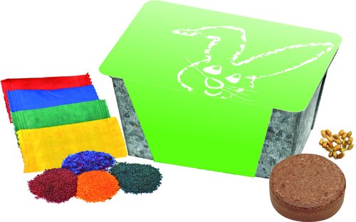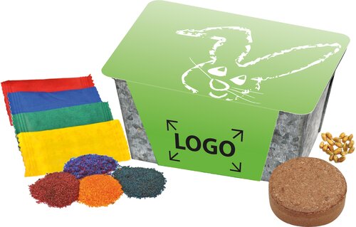 Ein komplettes Set Osterset zum Überreichen. In der Zinkwanne kann das Ostergras wachsen und mit den vier Eierfarben können die gekochten Ostereier bunt eingefärbt werden. Die umlaufende Banderole bietet ausreichend Platz für Ihre Werbebotschaft. Eine eigene Gestaltung der Banderole ist ebenfalls ab 250 Stück möglich.