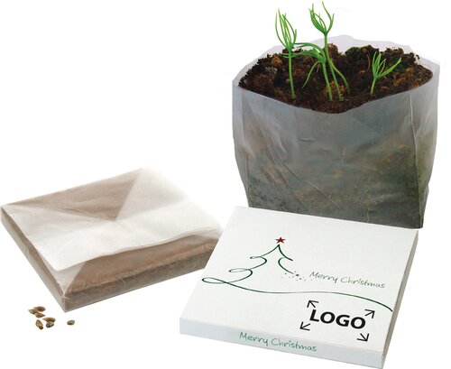 Das quadratische Wachstumsbehältnis beinhaltet die Erdtablette und Fichte-Samen für Ihren Weihnachtsbaum. Durch die flache Form lässt es sich gut überreichen. Einfach wässern und schon nach kurzer Zeit wächst eine kleine Baum-Pflanze. Platz für Ihren Werbeeindruck ist auf dem Standardmotiv des Schubers oder eine eigene Gestaltung, jeweils ab 250 Stück.