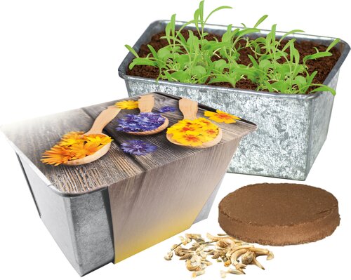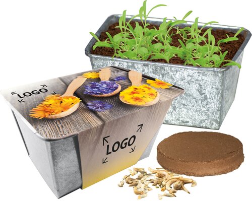Metallic, modern, der kleine Zinkbehälter für die Anzucht Ihrer wachsenden Grüße. Eingelegt in das Wachstums-Kästchen sind Erdtablette und esbare Blüten-Samen. Die umlaufende Banderole bietet Platz für Ihre Werbebotschaft ab 250 Stück. Eine eigene Gestaltung der Banderole ist ebenfalls ab 250 Stück realisierbar.