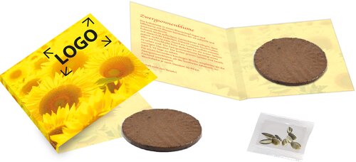 Dieses Kärtchen beinhaltet alles für die Anzucht und das Wachstum der eigenen Zwergsonnenblume. Eine Erdtablette und die Samenkörner sind eingeklebt. Die Pflanzanleitung ist auf der Innenseite des Kärtchens aufgedruckt. Platz für den Werbedruck, ab 250 Stück auf dem Standardmotiv, ist auf der Vorderseite des Kärtchens. Eine eigene Gestaltung ist ebenfalls bereits ab 250 Stück realisierbar.
