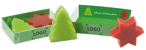 Überraschen Sie Ihre Kunden zu Weihnachten mit diesen hochwertigen Schafmilchseifen in Form eines Sterns und eines Tannenbaumes. Die natürlichen Zutaten Schafwollfett und Schafmilch sind eine Wohltat für die empfindliche Haut. Im Standardmotiv auf dem Einleger kann Ihr Werbeeindruck ab 250 Stück erfolgen. Eine individuelle Gestaltung ist ebenfalls ab 250 Stück möglich.