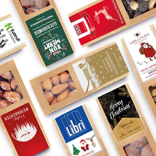 Ab 250 Stück mit Ihrem Motiv im 4c Druck auf dem Etikett der Faltschachtel, ab 2.500 Stück bedrucken wir den Faltschachtelkarton vollflächig: Der aufmerksamkeitsstarke Bestseller. Die Faltschachtel als nachhaltiges Premium-Giveaway. Ein Mandelkern, umhüllt von feinster belgischer Schokolade, bedeckt mit einem Hauch Kakaopulver. Die Kombination aus fein-herben Kakao mit zart-schmelzender Schokolade und einer knackigen Mandeln ist einfach unwiderstehlich. Sie suchen eine andere Größe? Dieses Premium Präsent ist auch als Mini Faltschachtel und Maxi Faltschachtel erhältlich.