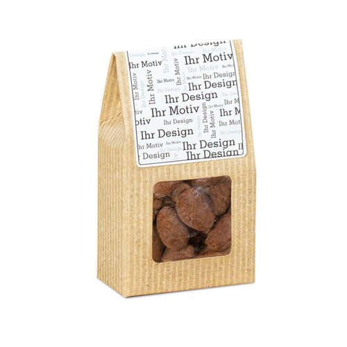 Ab 500 Stück mit Ihrem Motiv im 4c Druck auf dem Etikett der Faltschachtel, ab 2.500 Stück vollflächig bedruckt im Offsetdruck: Unser aufmerksamkeitsstarker Bestseller. Die Mini-Faltschachtel als nachhaltiges Premium-Giveaway. Ein Mandelkern, umhüllt von feinster belgischer Schokolade, bedeckt mit einem Hauch Kakaopulver. Die Kombination aus fein-herben Kakao mit zart-schmelzender Schokolade und einer knackigen Mandeln ist einfach unwiderstehlich. Sie suchen eine andere Größe? Dieses Premium Präsent ist auch als Faltschachtel und Maxi Faltschachtel erhältlich.