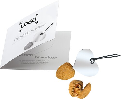 Diese schöne Weihnachtskarte enthält ein nützliches Design-Objekt für den täglichen Gebrauch. In der Winter- und Weihnachtszeit kommt dieser Nussknacker aus Edelstahl (in Herzform) zum Einsatz. Die Karte enthält keine Nuss. Platz für den Werbedruck ist auf dem Standardmotiv der Karte oder eine eigene Gestaltung, jeweils ab 100 Stück.