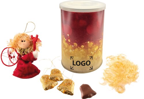 In der Dose finden Sie hübsche Accessoires, um Ihren Weihnachtsbaum oder Ihre Festtafel zu schmücken. Die Banderole bietet viel Platz für Ihren Werbeeindruck oder, ebenfalls ab 100 Stück, für Ihre individuelle Gestaltung.