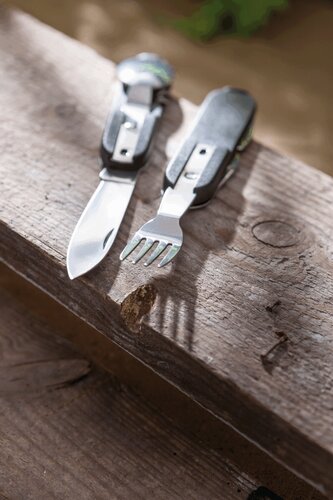 Edelstahl-Multifunktionswerkzeug WILDLIFE: mit ausklappbarem Messer, Flaschen- und Dosenöffner, Entschupper und Korkenzieher, ausziehbarer Gabel und Löffel, mit Schlüsselring, in Tasche mit integrierter Gürtelschlaufe und Klettverschluss – ideal für Camping, Picknick und Outdooraktivitäten